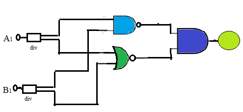 b. Write down the equation for the output. Note: The div block (Y connector) represented in the above diagram is to indicate that a particular input say A1 is connected as input to both the gates (NAND & NOR). The output of AND gate is given to a Green LED.