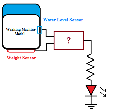 When the weight is overloaded (logic 1 o/p of weight sensor) or the water level is low (logic 1 o/p of level sensor) or both conditions are true, which gate should be used to indicate alarming condition?